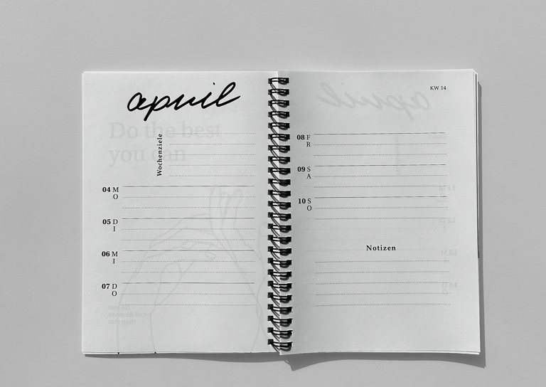 Design of an agenda 2020. In addition to the calendar pages, I supplemented the pages between the months with my own drawings and encouraging sayings. I wrote the individual months in my own handwriting and inserted them, creating a personal and aesthetic book.