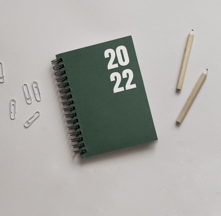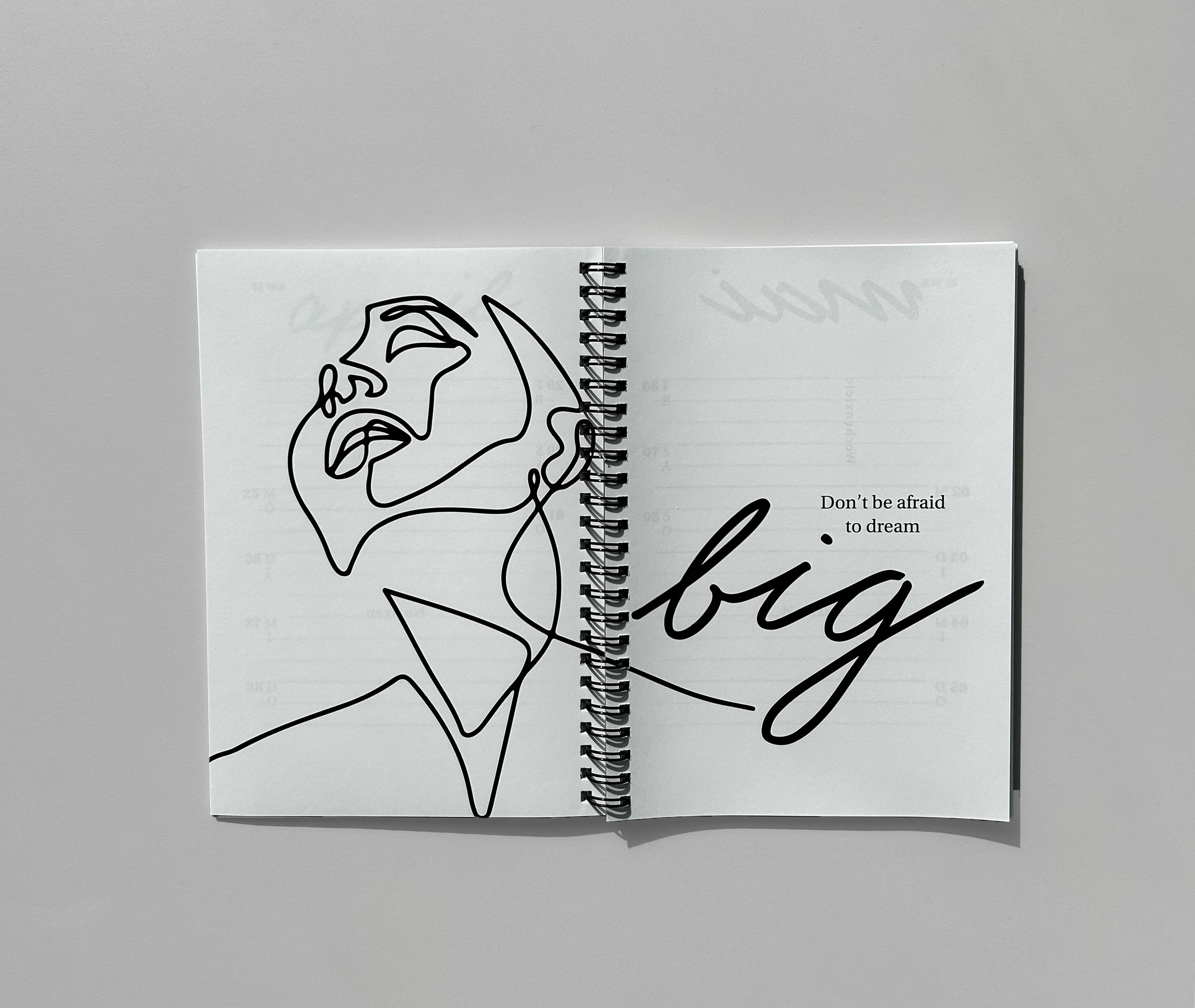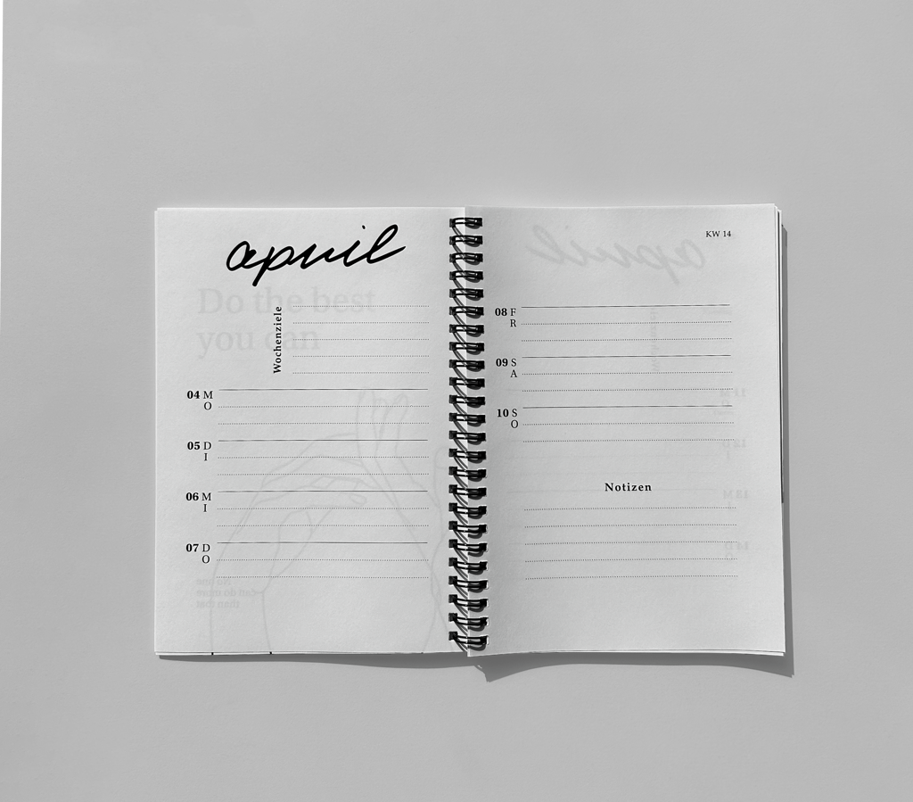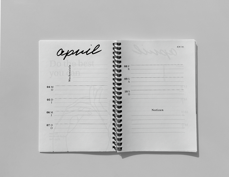 Design of an agenda 2020. In addition to the calendar pages, I supplemented the pages between the months with my own drawings and encouraging sayings. I wrote the individual months in my own handwriting and inserted them, creating a personal and aesthetic book.